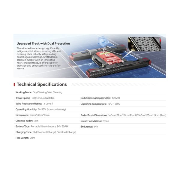 The RHINO700-EC6 Remote-Controlled Crawler Solar Panel Cleaner comes fitted with two adaptive extra-wide floating roller brushes—one mounted at the front and the other secured at the rear. These brushes keep continuous contact with the surfaces of solar modules, thereby delivering comprehensive cleaning results without leaving any streaks. Integrated into the robot is an intelligent parking and storage feature; this not only prevents the brushes from warping but also prolongs the device’s lifespan. Additionally, the robot’s built-in anti-fall system boosts operational safety: it allows the robot to run stably even when moving over complicated terrains, further making solar panel cleaning safer, more efficient, and less reliant on manual labor.
